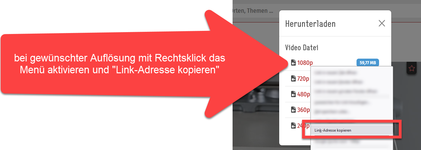 - bei der gewünschter Auflösung mit einem Rechtsklick das Menü aufrufen und "Link-Adresse kopieren" anklicken.