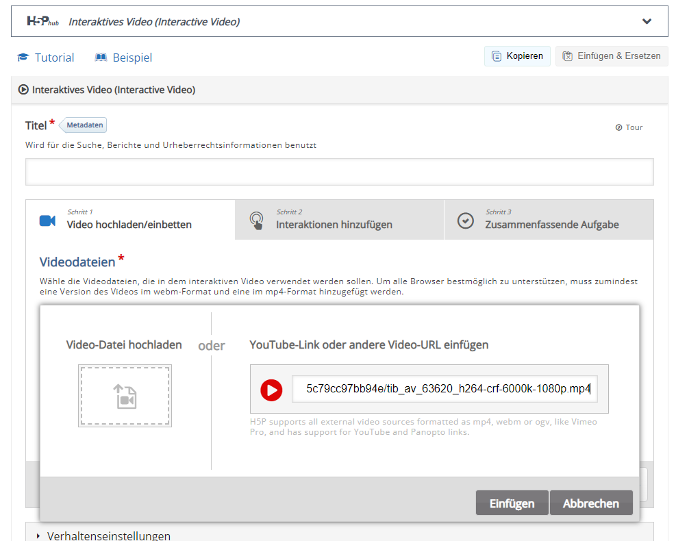 Die URL zum Video im AV-Portal kann so im H5P-Element "Interaktives Videos" als URL eingesetzt werden.