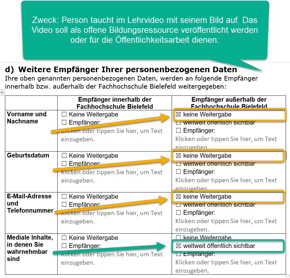 - Beispiel 2: Veröffentlichung als OER-Material Die Verarbeitung Ihrer oben genannten personenbezogenen Daten dient dazu… „im Rahmen des Projektes XY als Open Educational Resources (OER) veröffentlicht zu werden. Die oben genannten personenbezogenen Daten werden in offen lizenzierten Bildungsmaterialien verwendet. In gewissem Rahmen erlauben OER auch Nachnutzenden innerhalb und außerhalb der HSBI Bielefeld diese Materialien zu vervielfältigen, zu bearbeiten und erneut zu veröffentlichen.“.