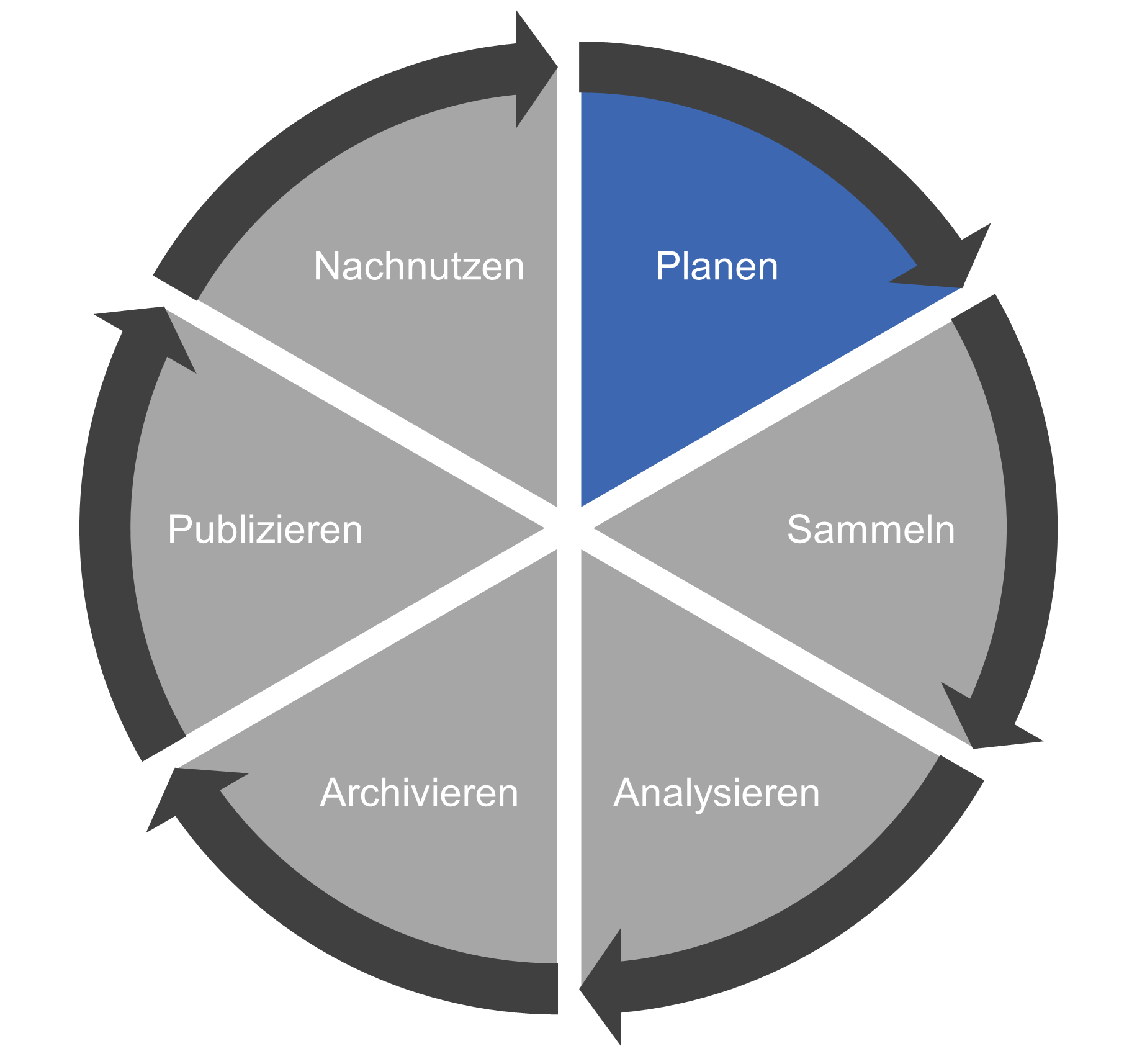 Die Planung zur Erhebung oder Nachnutzung von Forschungsdaten ist der erste Schritt im Datenlebenszyklus. Bereits bei der Planung eines Forschungsvorhabens bietet es sich an festzulegen, welche Daten in welchem Umfang erstellt werden. Zu diesem Zeitpunkt werden idealerweise rechtliche Anforderungen frühzeitig identifiziert und geklärt.